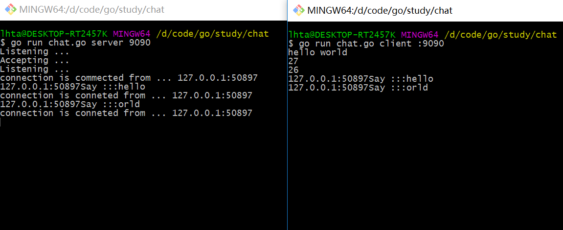 // 服务器接收线程 func Handler(conn net.Conn, messages chan string){ fmt.Println("connection is commected from ...", conn.RemoteAddr().String())