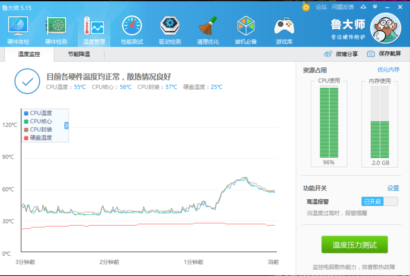 M3是低功耗无风扇设计。只开浏览器,任然能够感觉到温热。大夏天的,拿着还是有点担心发热量。鲁大师查看cpu,主板温度一直保持不超过60的温度。压力测试下,CPU刚开始比较高,最高到70,逐渐下降到57。还是比较放心。话说螃蟹的小Y开机就70度.