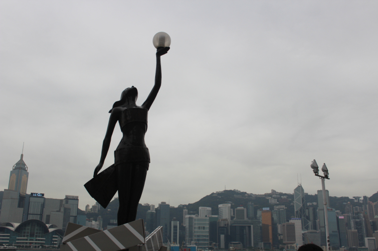 沿着星光大道慢慢走,很多游人在拍照。地上地板,隔不远就刻着一个香港电影名人的名字,还有手印。也有些雕塑,不少人借此拍照。