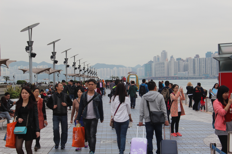 坐地铁到尖沙咀,很多出口,随便找了个出口出来。信步走了下,就看到了江边(应该算海边),走近,才发现是星光大道。看海,有点入上海外滩的感觉,也有游轮,海门稍宽,对面是山,还能看到山上有房子,旁边有人议论,说那是豪宅了。