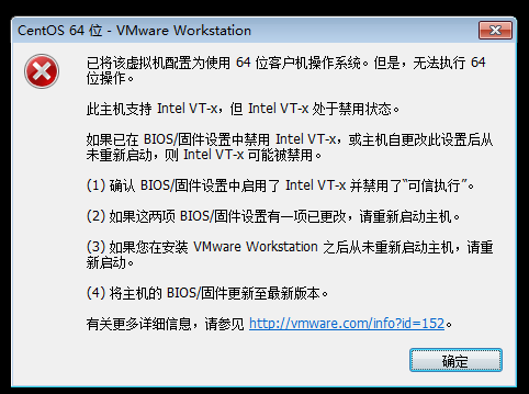 1 | 已将该虚拟机配置为使用 64 位客户机操作系统。但是,无法执行 64 位操作。 |