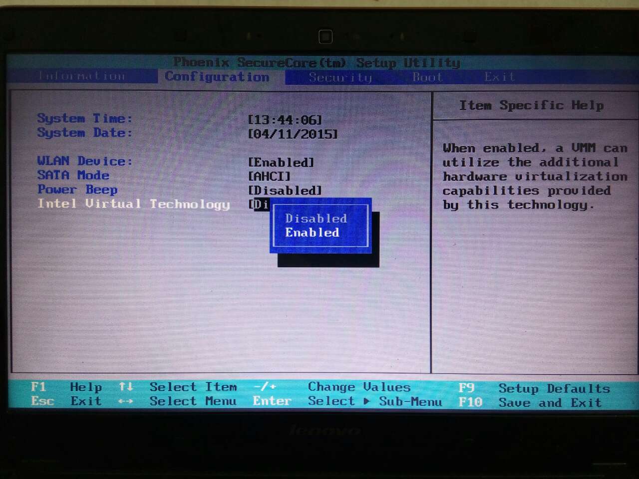 提醒信息已经说的很清楚了,要在 BIOS 中开启Intel VT-x(应该是英特尔虚拟化技术)。按照提示信息, 在自己电脑上的解决方法: