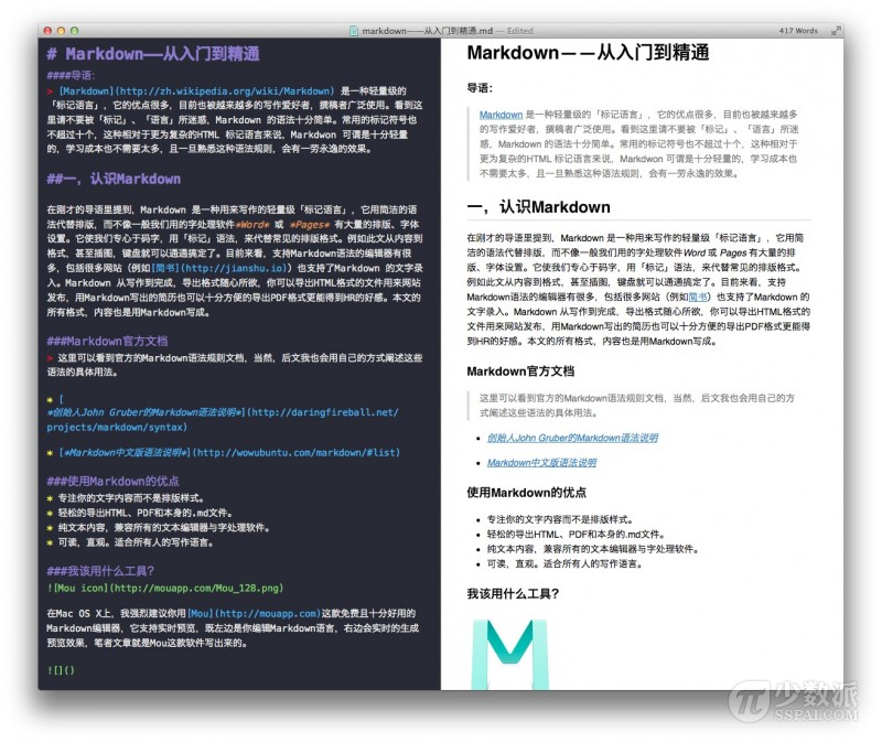 在 Mac OS X 上,我强烈建议你用 Mou 这款免费且十分好用的 Markdown 编辑器,它支持实时预览,既左边是你编辑 Markdown 语言,右边会实时的生成预览效果,笔者文章就是 Mou 这款应用写出来的。
