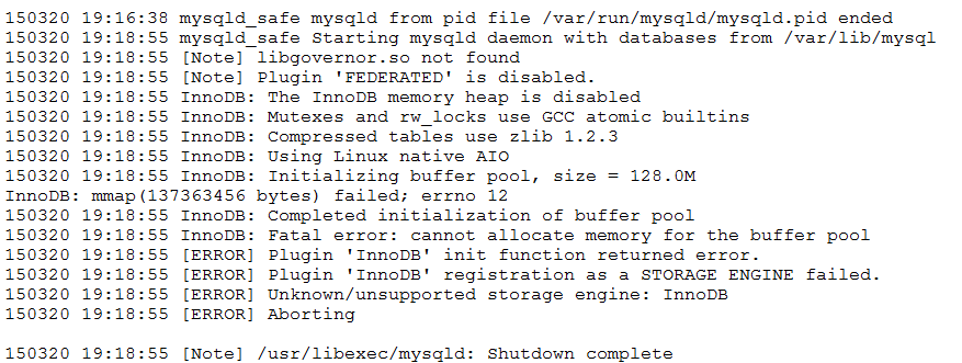 | 150320 19:16:38 mysqld_safe mysqld from pid file /var/run/mysqld/mysqld.pid ended 150320 19:18:55 mysqld_safe Starting mysqld daemon with databases from /var/lib/mysql 150320 19:18:55 [Note] libgovernor.so not found 150320 19:18:55 [Note] Plugin 'FEDERATED' is disabled. 150320 19:18:55 InnoDB: The InnoDB memory heap is disabled 150320 19:18:55 InnoDB: Mutexes and rw_locks use GCC atomic builtins 150320 19:18:55 InnoDB: Compressed tables use zlib 1.2.3 150320 19:18:55 InnoDB: Using Linux native AIO 150320 19:18:55 InnoDB: Initializing buffer pool, size = 128.0M InnoDB: mmap(137363456 bytes) failed; errno 12 150320 19:18:55 InnoDB: Completed initialization of buffer pool 150320 19:18:55 InnoDB: Fatal error: cannot allocate memory for the buffer pool 150320 19:18:55 [ERROR] Plugin 'InnoDB' init function returned error. 150320 19:18:55 [ERROR] Plugin 'InnoDB' registration as a STORAGE ENGINE failed. 150320 19:18:55 [ERROR] Unknown/unsupported storage engine: InnoDB 150320 19:18:55 [ERROR] Aborting