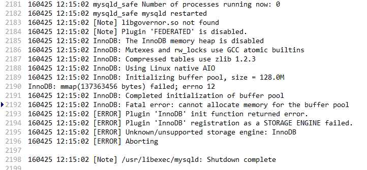 现在看到cannot allocate the memory for the buffer pool。明显是内存不足。使用free命令查看,内存只有67M