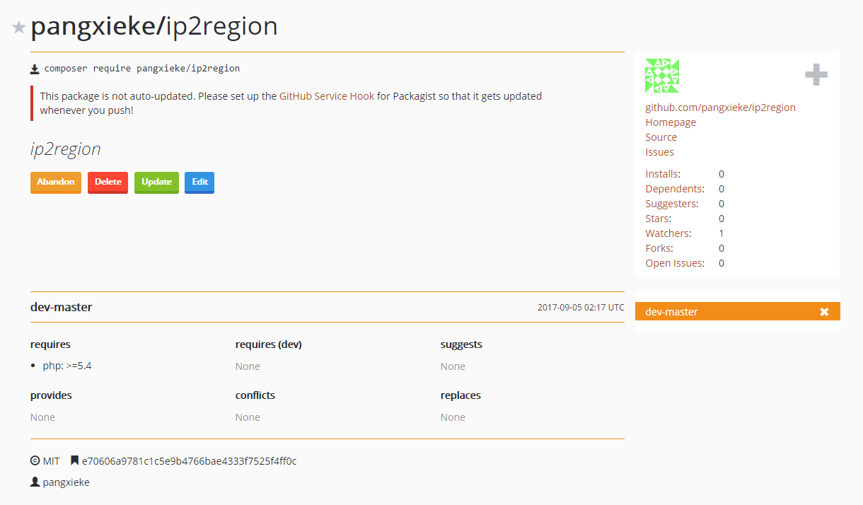 假如你每次更新了项目,还需要到packagist点击update,十分麻烦。所以这里最好设置一个自动同步,当然packagist提供了api的方式来操作,这个也是挺麻烦。packagist和github已经打通了,可以直接在github上设置就行了。ok