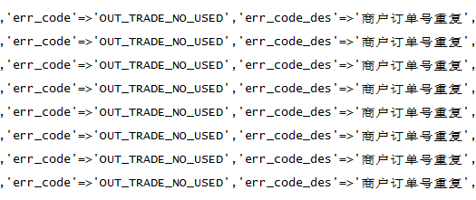 今天新版本上线,但微信支付一直返回fail。查看微信返回信息'err_code'=>'OUT_TRADE_NO_USED','err_code_des'=>'商户订单号重复
