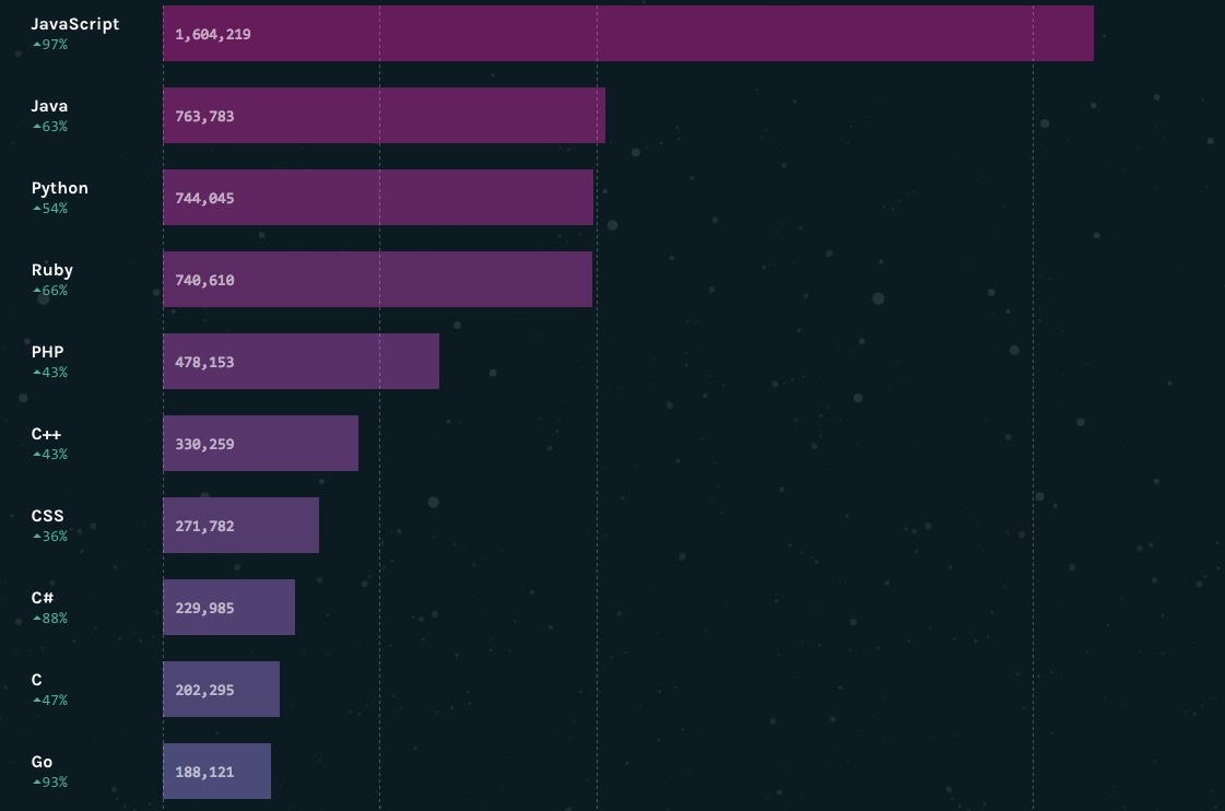 上图是 GitHub 根据过去 12 月提交的 PR 数量来排名的,虽然不完全准确,但是 PR 起码代表了项目的热度与欢迎度。JavaScript高居榜首。