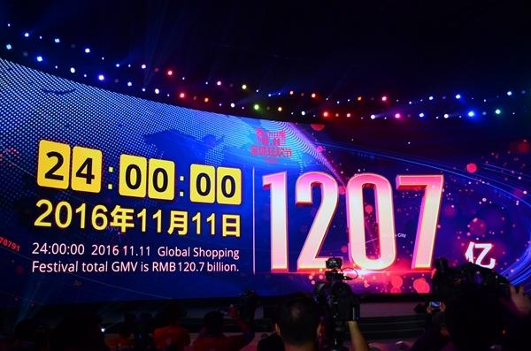 截至11日24:00:00,2016年天猫双11全球狂欢节总交易额1207亿元,无线交易额占比81.87%,覆盖235个国家和地区。