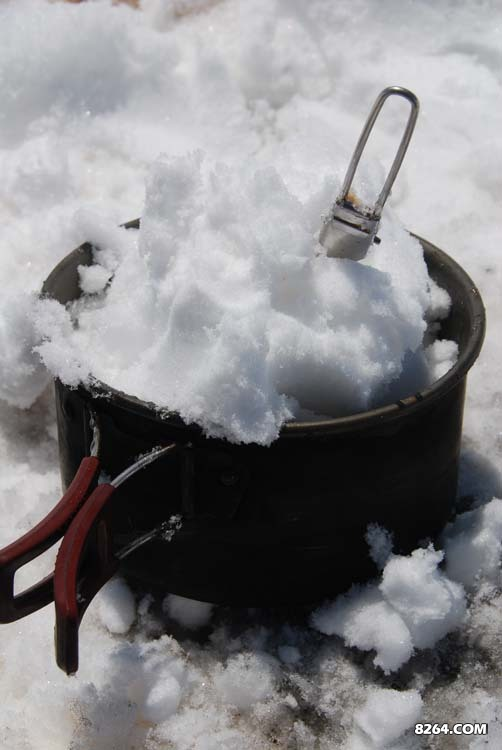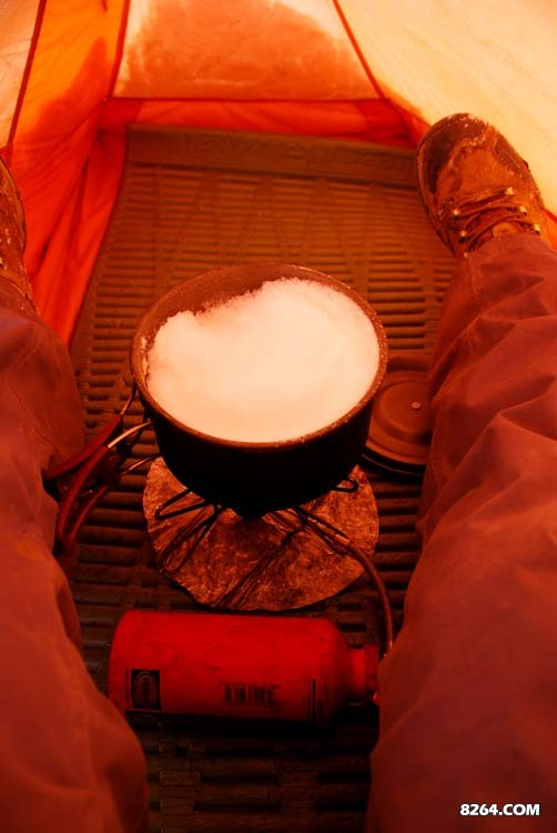 水是不缺了,雪水是极品,问题是非常耗费汽油。此行带了8.6升93号汽油,油炉是多啦的MSR耳语,大锅1.5升,主要是烧水用,经过几天下来的实测,烧水需时如下:液体水,早晨要用16分钟烧开,晚上则快些,14-15钟的样子。化冰35-40分钟左右,化雪耗时最长,45-50分钟。化雪极耗汽油,所以在雪和轻度盐碱水同存的情况下,我多数会选择后者作为水源。